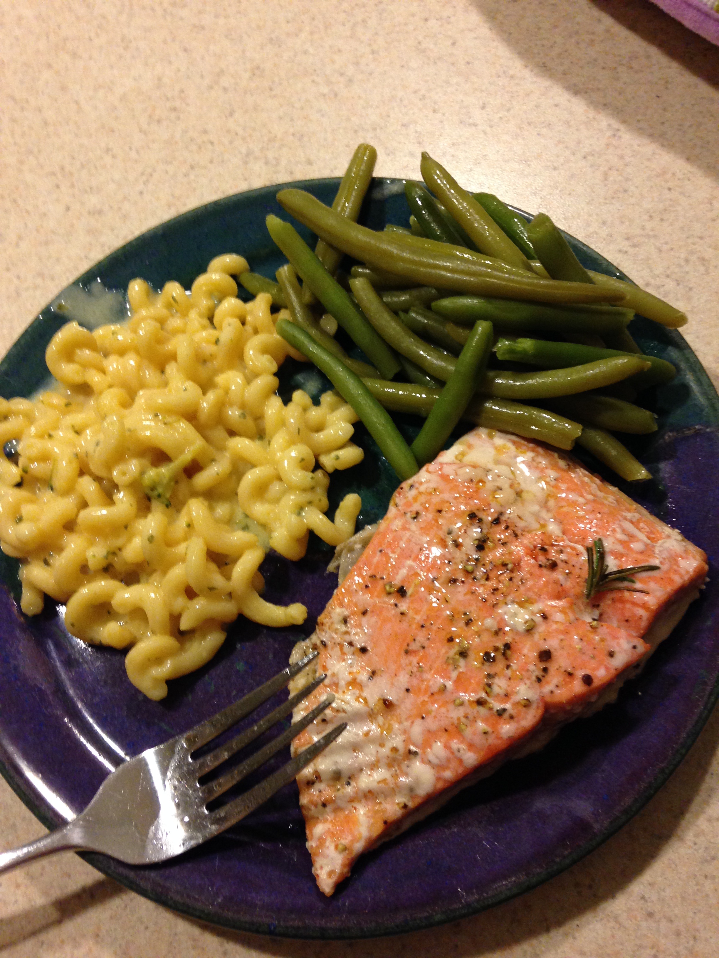 I lined a glass baking dish with tin foil and placed the thawed salmon fillets in it, drizzled some olive oil, himalayan pink sea salt, freshly ground pepper, fresh lemm\on and rosemary from the bush out front, covered it and it went in a 400 degree oven for about 15 minutes, it’s up to you how long you bake and depends on the thickness of your fillets and how raw you like it… Sauteed the green beans with olive oil and a dash of salt, then prepared the mac and cheese. All done ; )