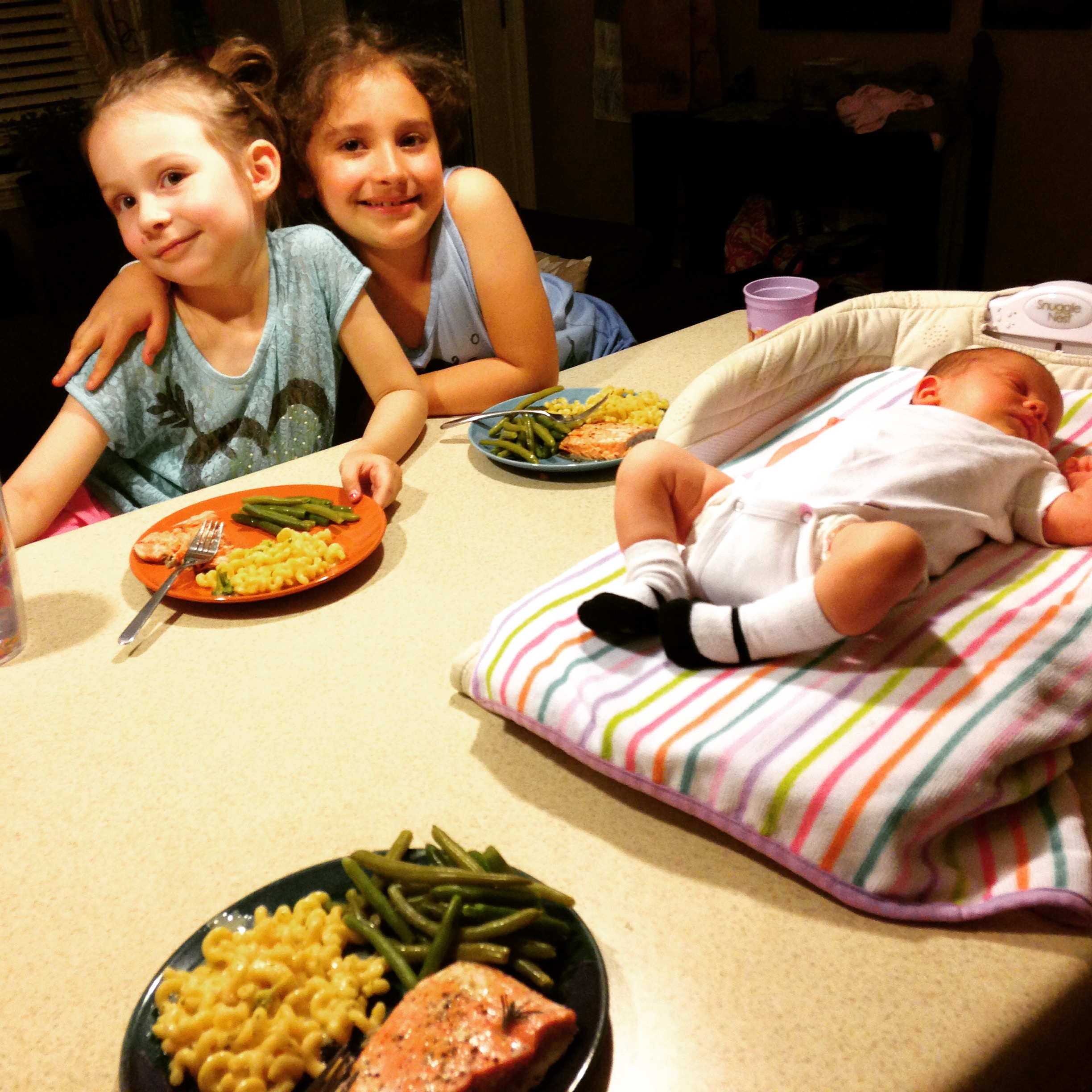 I have to admit it’s absolutely amazing having three girls, yes, it’s busy and slightly chaotic at times but oh so much fun! Dinner time is always crunch time though, whether you’re single or have 10 kids, it doesn’t matter. Getting healthy food that didn’t cost a fortune or require every pot you own is tough! I was able to get dinner on the table in under an hour, 3 pans to wash and my kids (YES! even Amelie!) ate it! Yes I want a medal, or at least a cookie! So here goes…. I hit up Trader Joe’s, my go to grocery store, and got sockeye salmon fillets from the frozen section, I usually go fresh but their selection didn’t look too appealing, frozen organic green beans and a bottle of Chilean Sauvignon blanc (hooray I can have wine again!!!!) I have a packaged pasta at home and while I hate processed food, you can win every fight. All in I spent less than $20 including the wine, I call that a win!