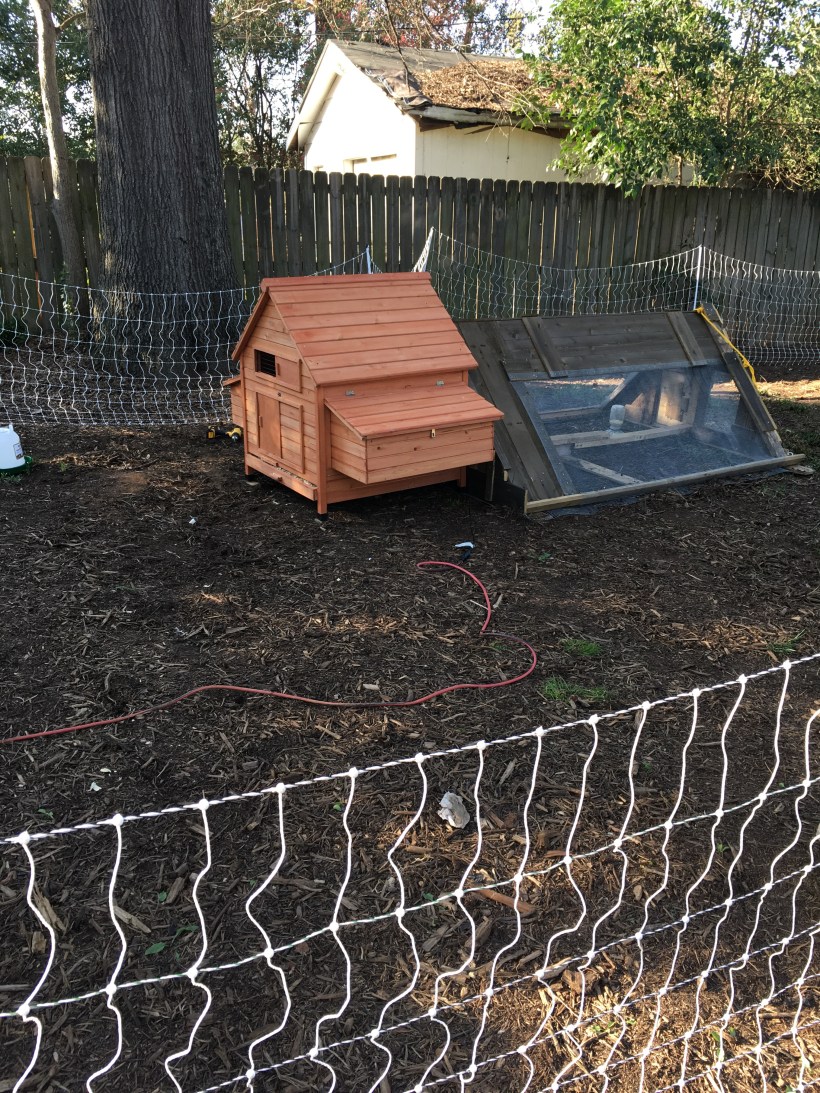 This is a coop-tor, part coop, part chicken tractor, designed to give the girls plenty of space to roam when it’s warm and the coop still has two heat lamps for them at night when it cools down!